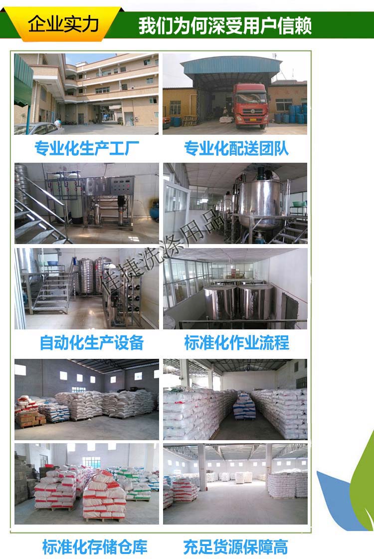 东莞市佳捷洗涤用品公司成立于二零零一年,该公司是一家自主研发及生产星级酒店宾馆、医院、洗衣厂、等洗涤厂的洗涤化料厂。工厂拥有现代化的生产车间和先进配套的生产设备,齐全的化学实验室。凭借公司的专业知识和对行业的广泛了解,成就了现在佳捷高质量的产品。公司通过IS09000质量管理认证体系,实施6S现代化管理,拥有雄厚的资力、独立的企业研发团队,具有工程师职称、博士以上学历的员工高达30%。从原材料到售后服务均采用最先进的电脑管理模式,引起同行业的关注,企业总体素质在同行具有一定的影响力,成为洗涤行业中的一支重要的供应商。